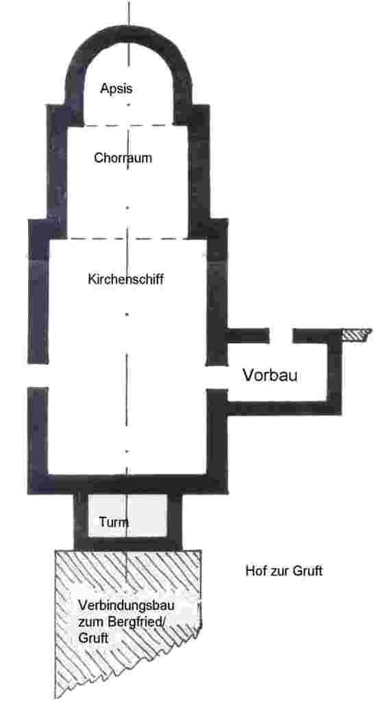 Der Bau der Kirche läßt sich nicht exakt datieren. Bestimmte Elemente, wie z.B. die Gestaltung des nördlichen Eingangsportals oder die Säulen in den Schalllöchern am Turm weisen durch ihren "entwickelten romanischen Stil" auf eine Errichtung der Kirche im 12.Jh. bzw. Anfang des 13.Jh. hin. Das Gebäude ist vom Typ her eine schlichte romanische Saalkirche wie es viele im Saalkreis gibt. Der Bau gliedert sich von Ost nach West in eine Apsis, an die sich ein etwas breiterer Chorraum anschließt, worau dann ein noch etwas breiteres Kirchenschiff folgt, welches wiederum am Ende von einem schmaleren Westturm abgeschlossen wird. Das gesamte Gebäude ist aus Porphyrbruchsteinen errichtet. Einem Baustoff der hier aus dem Steinbruch unmittelbar am Ort gefördert werden konnte. Lediglich die Quader, welche die Eckverbände des Gebäudes bilden, sowie die Tür- und Fenstergewände und Bögen bestehen aus Sandstein.